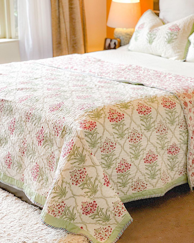 A subtle printed bedspread/bedsheet with reversible pillow cases. The design pattern is stamped by hand, on premium 210TC cotton fabric with hand-carved wood blocks dipped in natural vegetables dyes.